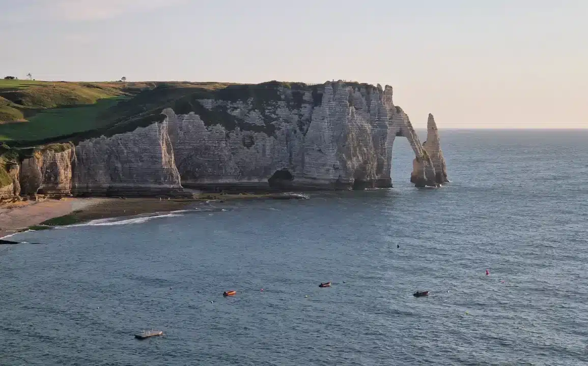 Depuis ce point de vue, on domine toute la plage d’Étretat et l’on distingue clairement plusieurs formations rocheuses emblématiques : la Porte d’Amont, arche naturelle creusée par l’érosion marine, et surtout l’Aiguille d’Étretat, ce piton de craie haut d’environ 55 mètres qui surgit de la mer.